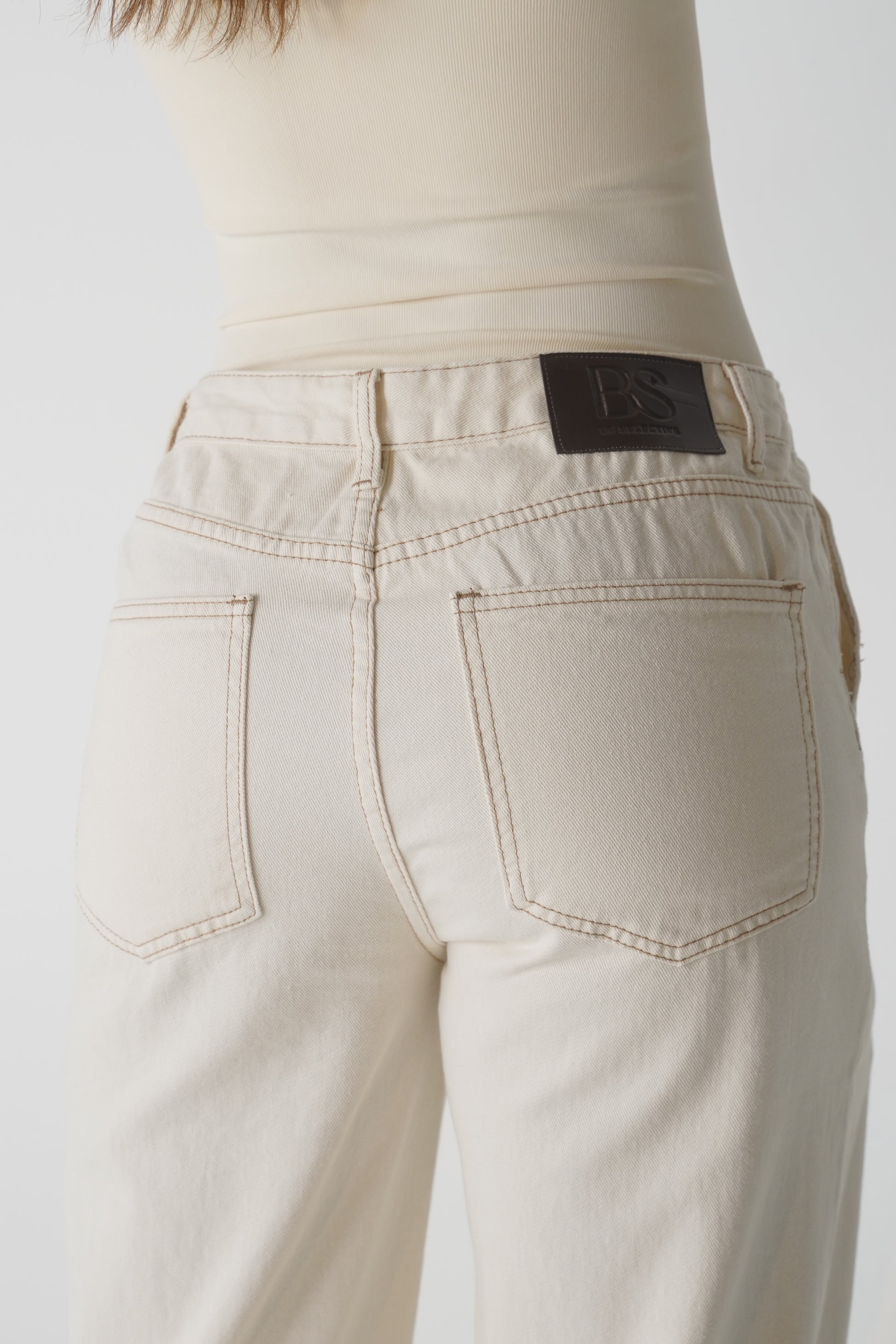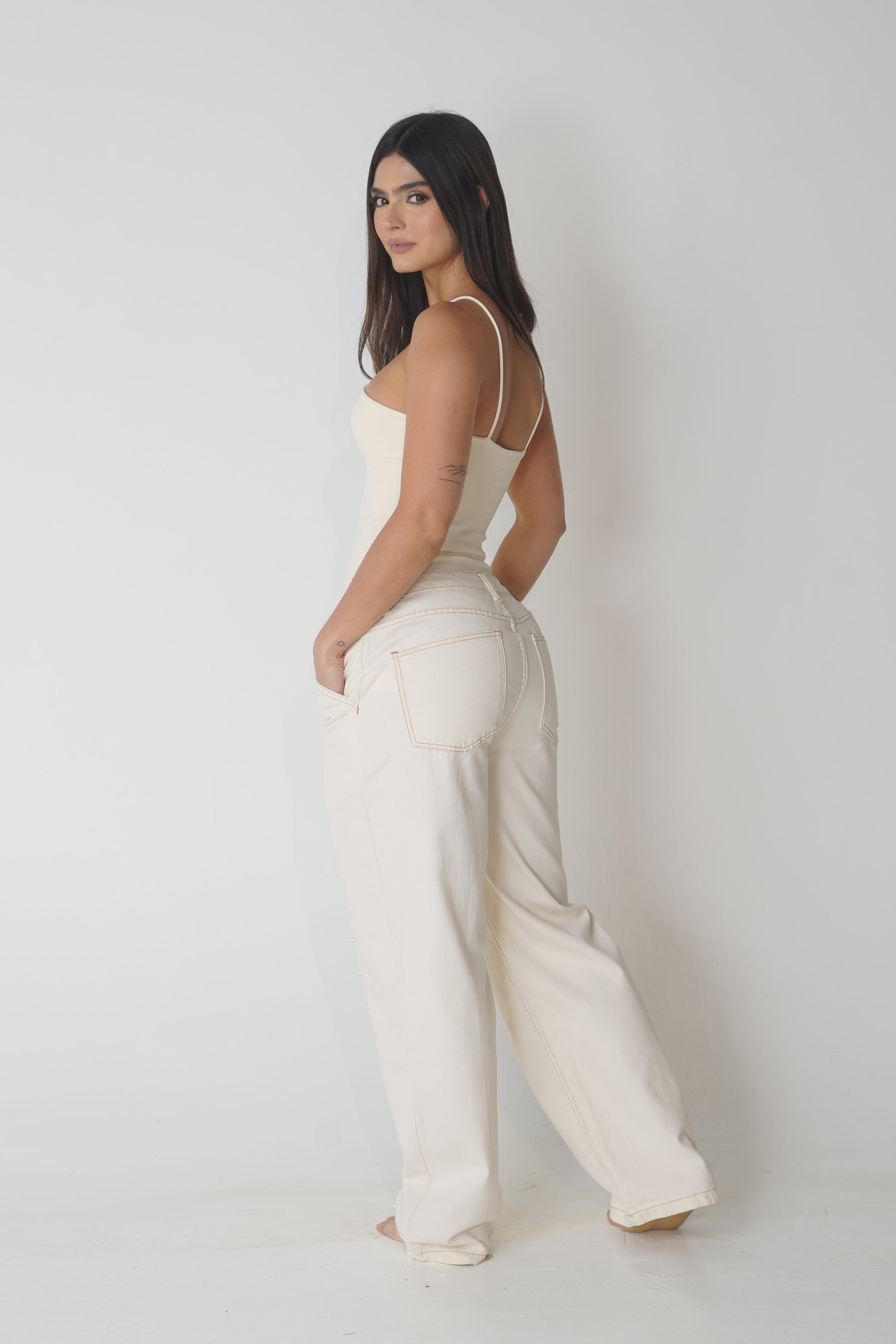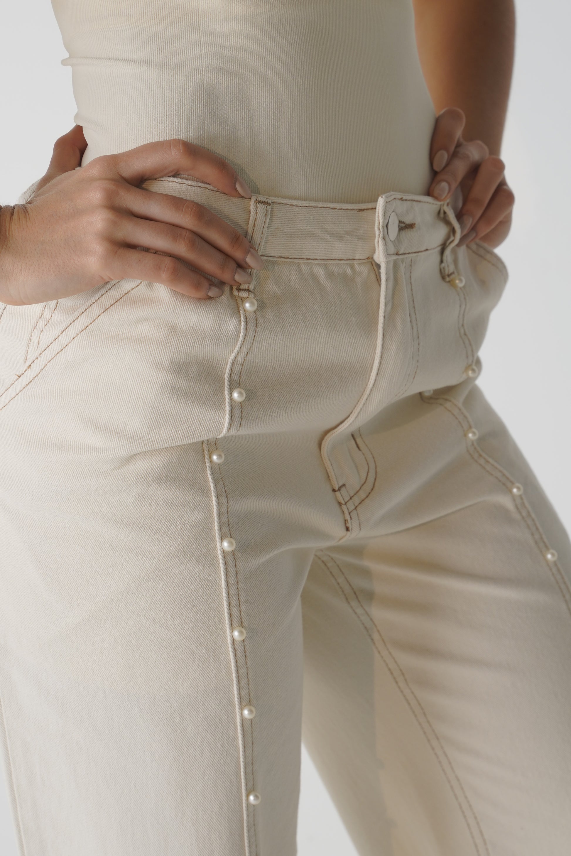 Nuestro Jean Perlé Crudo combina la atemporalidad del denim con la delicadeza de las perlas handmade, creando una pieza única que respira sofisticación.