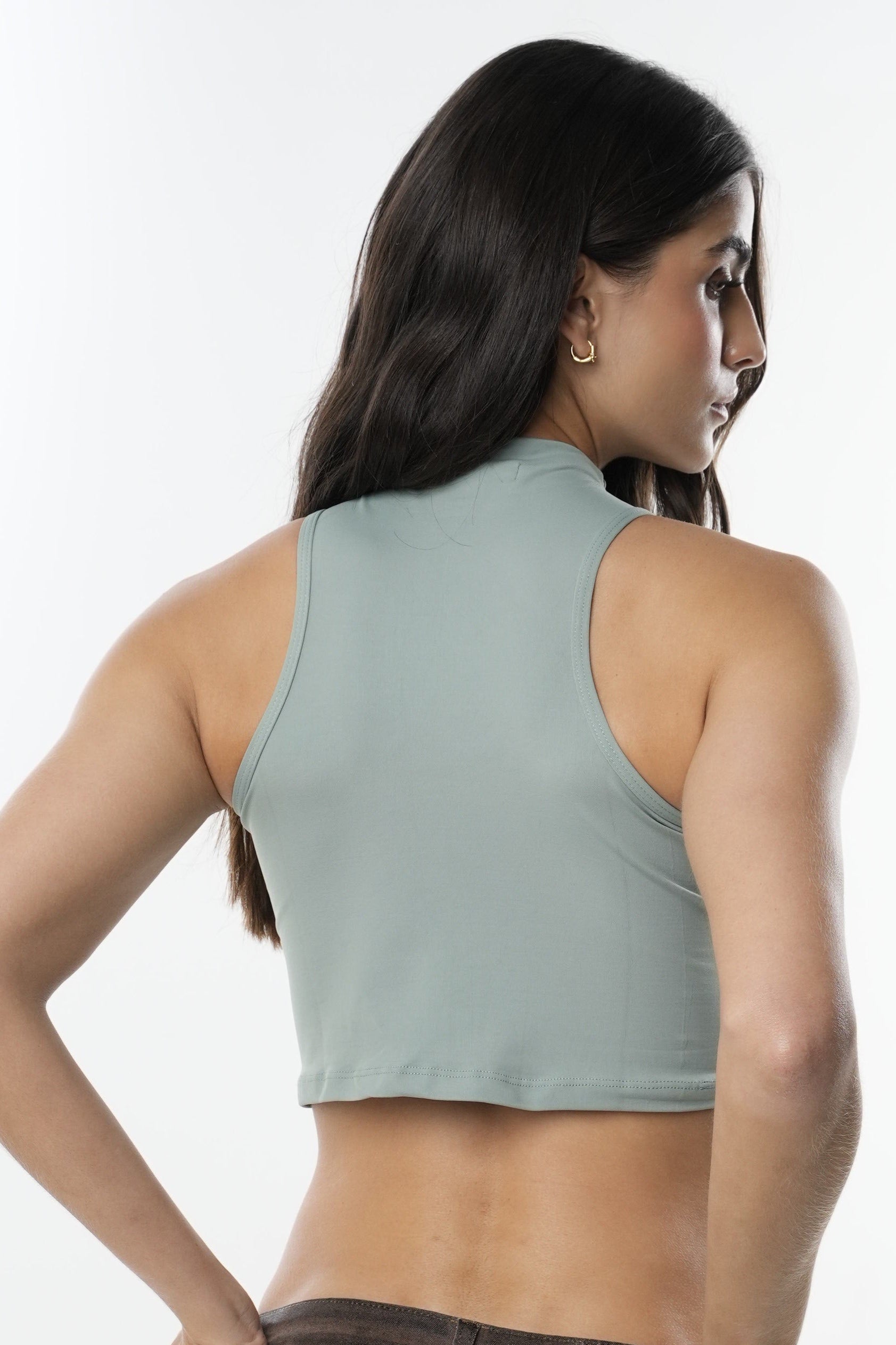 Su diseño minimalista y cuello ligeramente elevado lo convierten en una prenda versátil, perfecta para lucir sola o como base en capas.